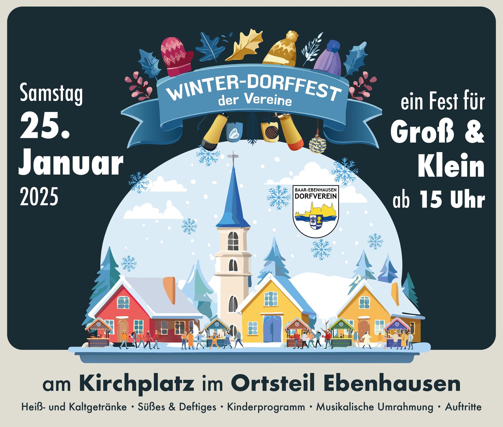 Am Samstag, den 25. Januar 2025 veranstalten wir zum ersten Mal unser Winter-Dorffest der Vereine am Kirchplatz im Ortsteil Ebenhausen, ein Winterfest für Groß & Klein. Die Veranstaltung beginnt um 15.00 Uhr und bietet neben süßen und deftigen Schmankerln natürlich auch Kalt- und Heißgetränke.